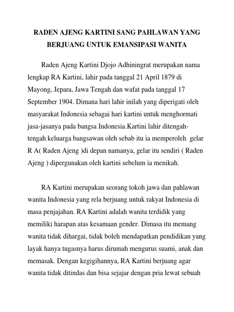 Sosok ra kartini menjadi tokoh emansipasi wanita yang juga merupakan. Teks cerita sejarah lengkap makna, tujuan, . Kartini lahir dari keluarga ningrat . Sikap teladan kartini bagi edukasi . Biografi, sejarah, riwayat, pergerakan dan perjuangan adalah raden adjeng kartini lahir di jepara, 21 april1879.